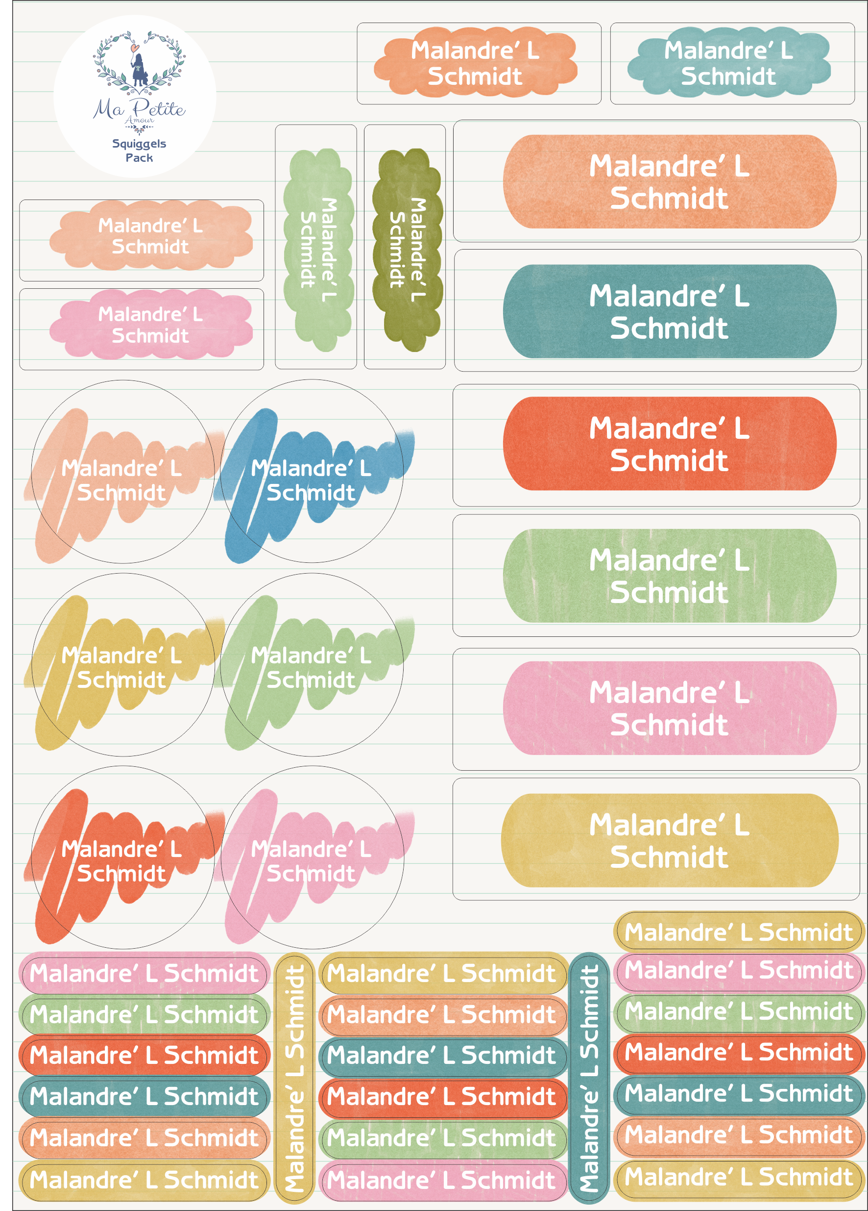 Squiggles themed school labels to help label all your little one's school items. Personalised with their names in an easy to read font.