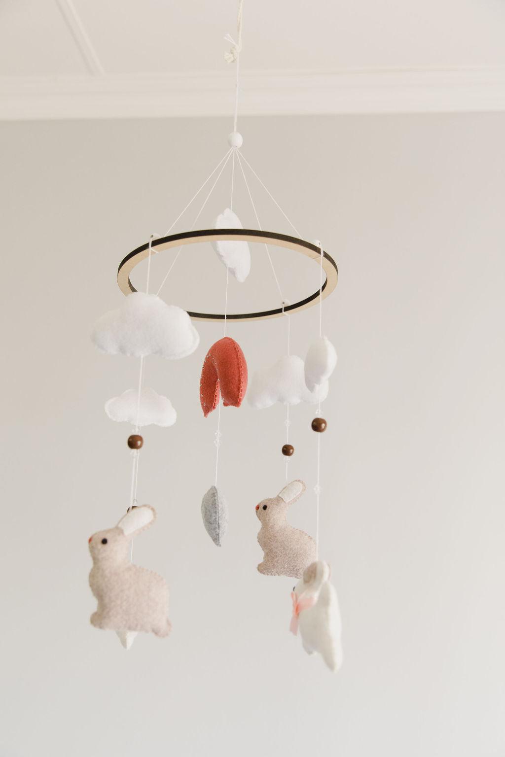 This handmade felt mobile includes the prettiest bunnies, amongst fluffy white clouds and a centre rainbow.