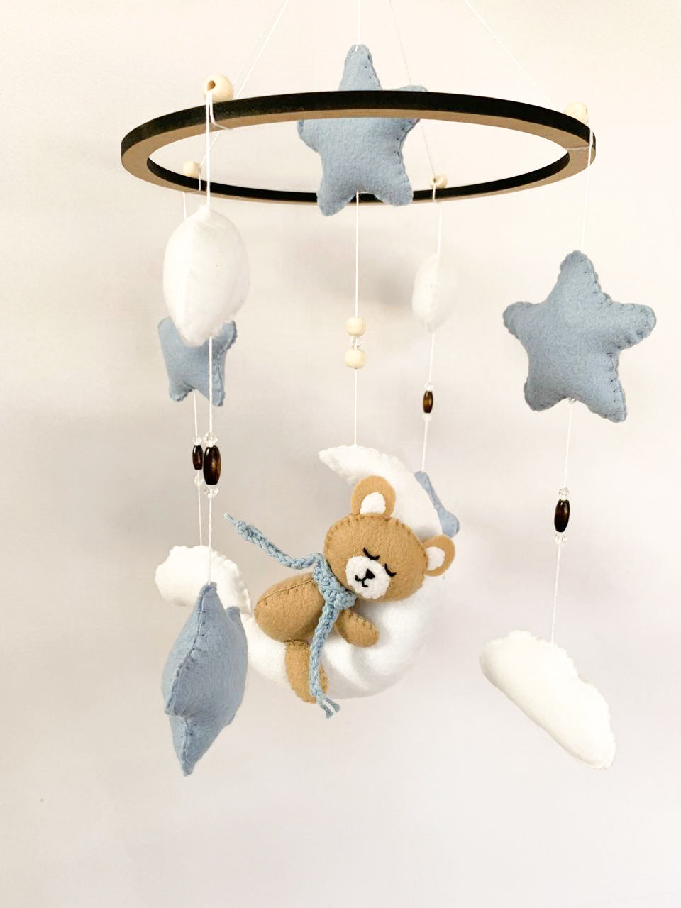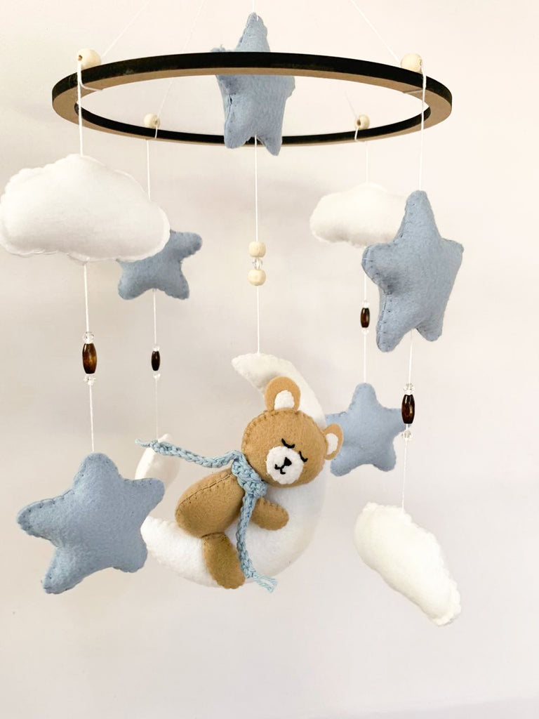 This handmade felt mobile includes the cutest sleeping bear, surrounded by stars and clouds.
