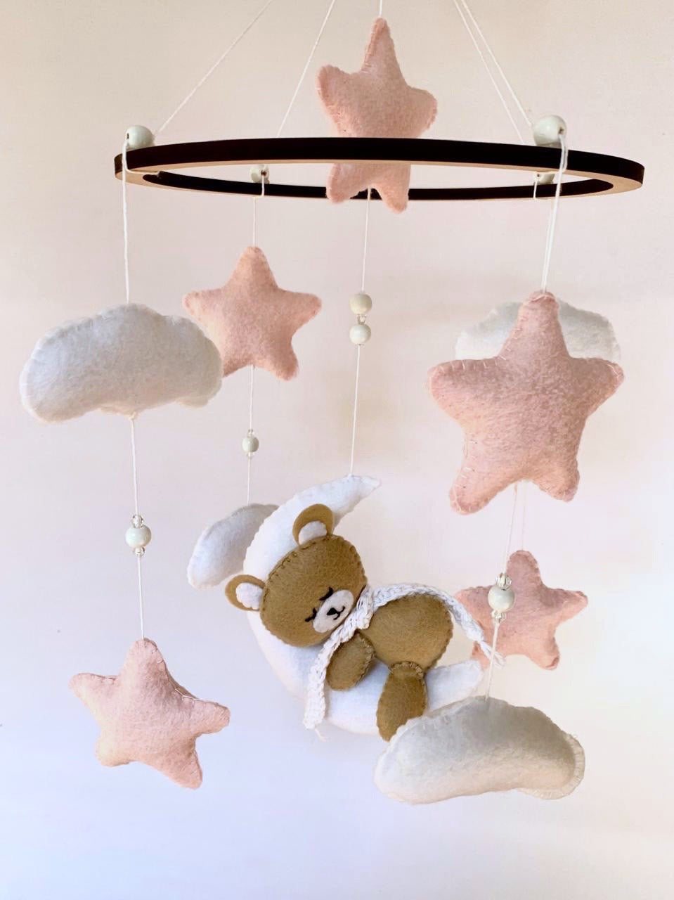 This handmade felt mobile includes the cutest sleeping bear, surrounded by stars and clouds.