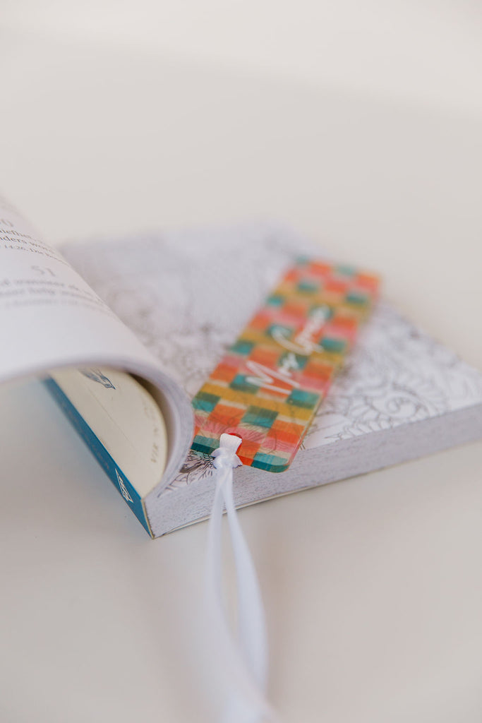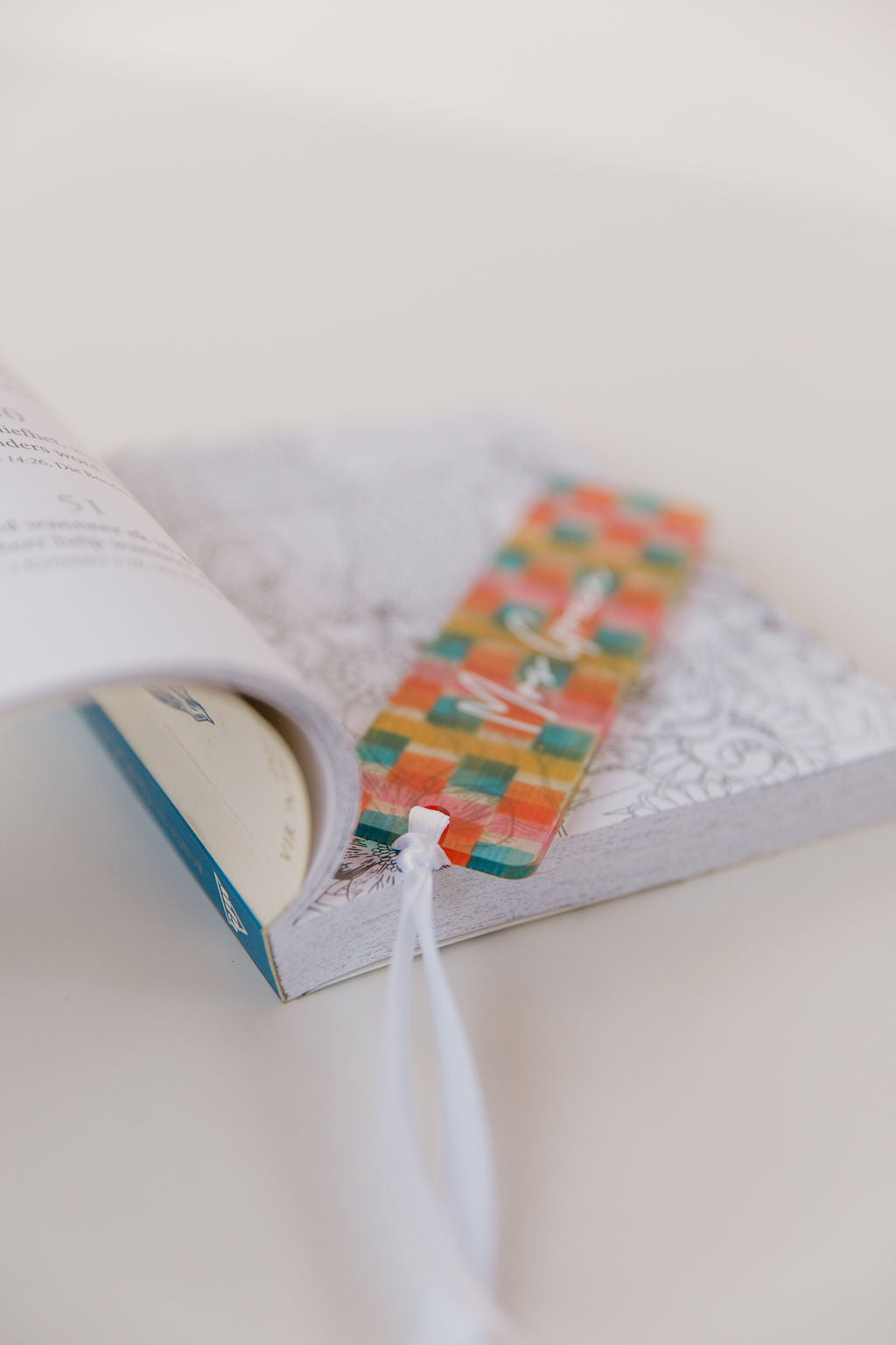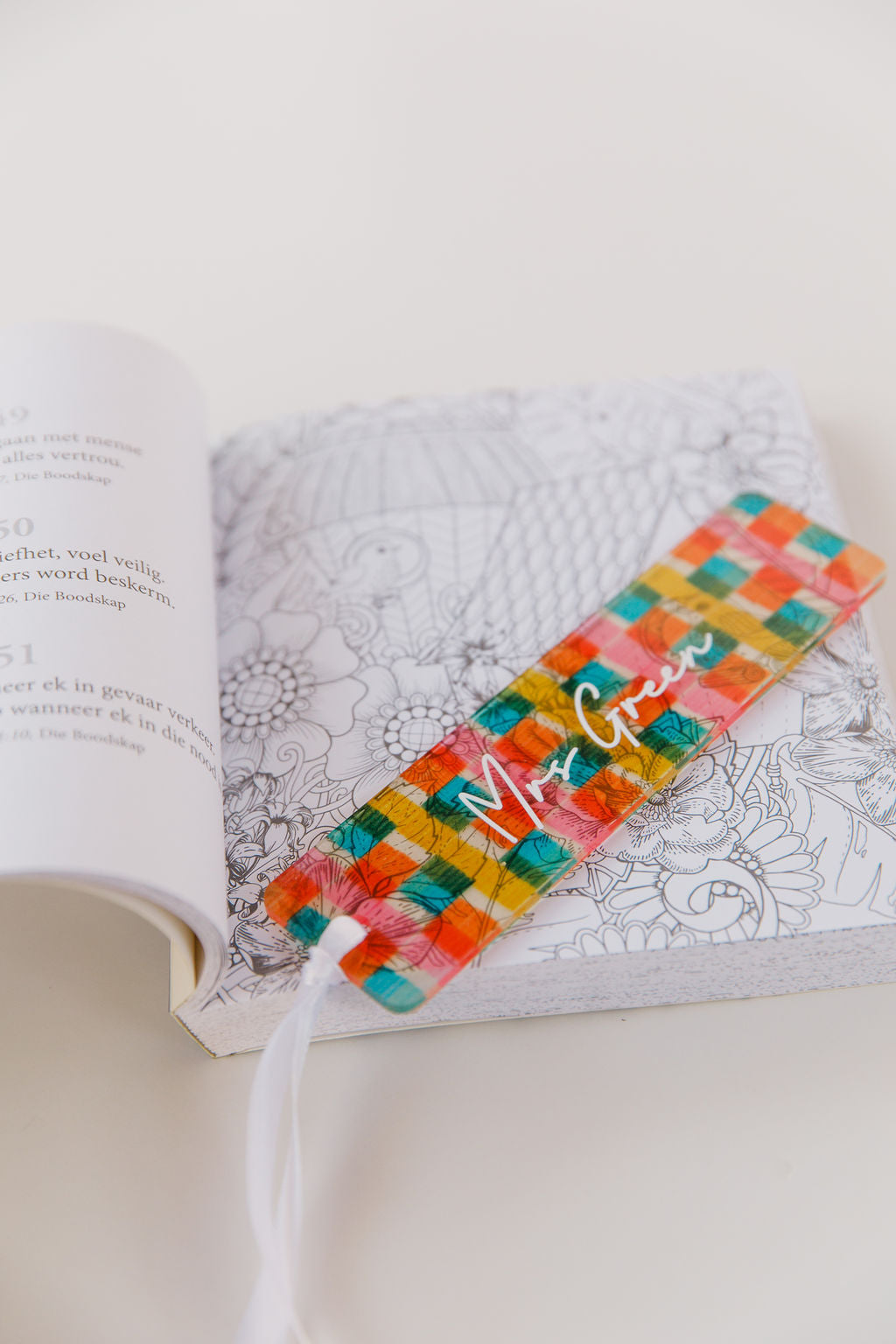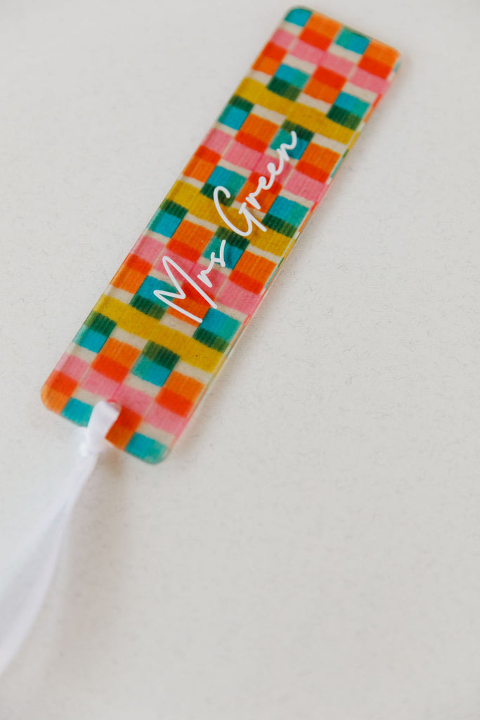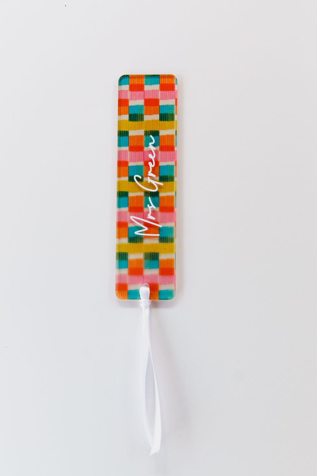Personalised acrylic book mark with a beautiful uv printed colourful pattern, including your selected name. Finished off with a white satin ribbon.