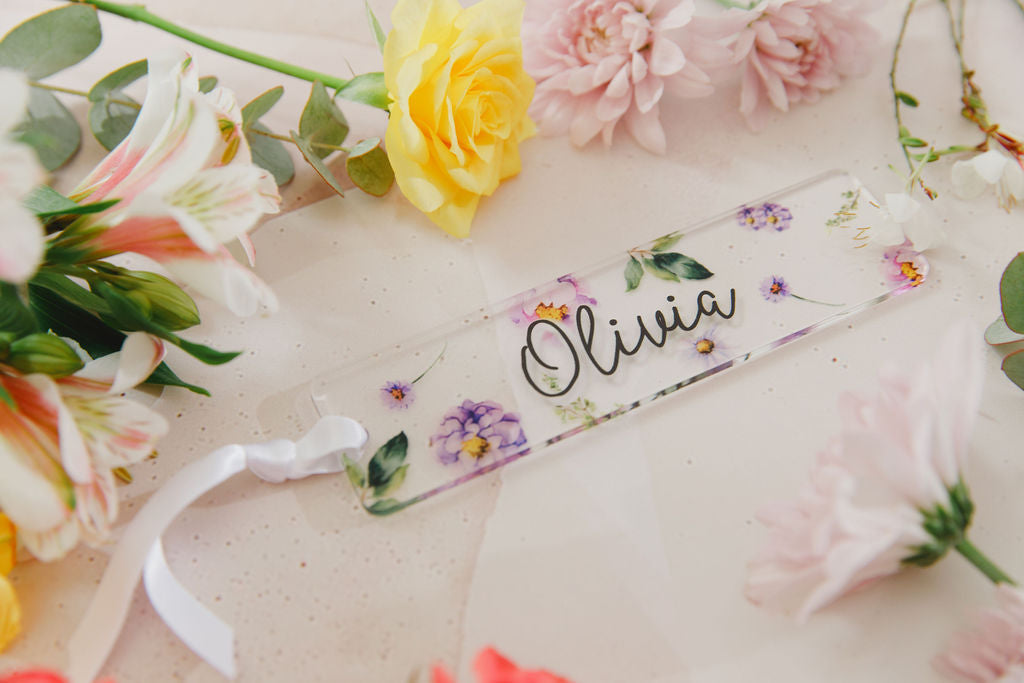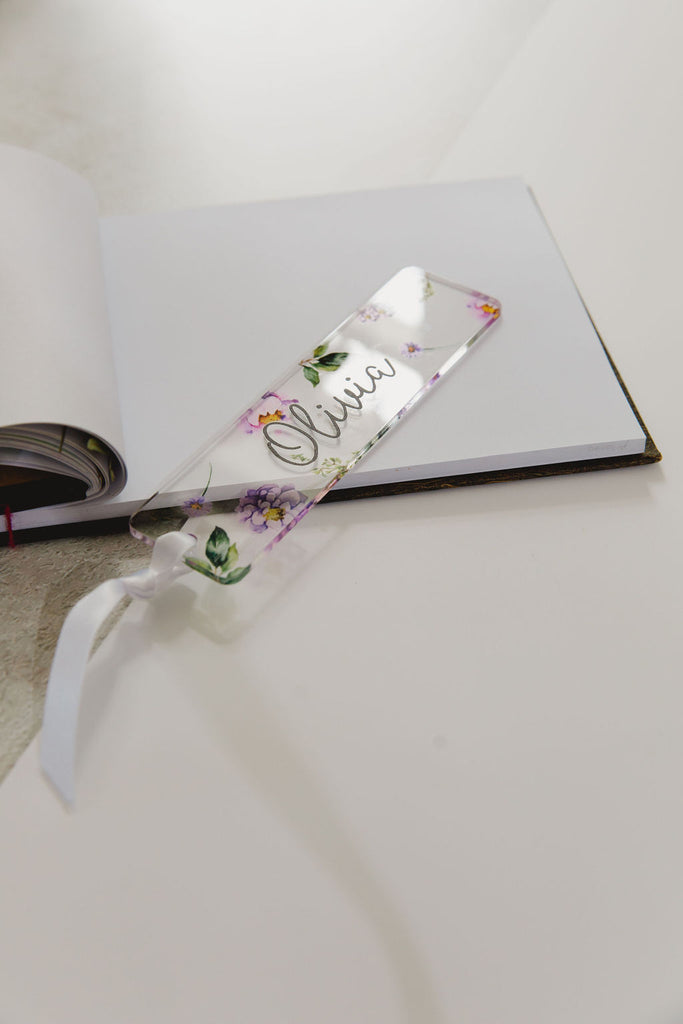 Personalised acrylic book mark featuring a beautiful purple flowers and personalised with your requested name. Finished off with a white satin ribbon.