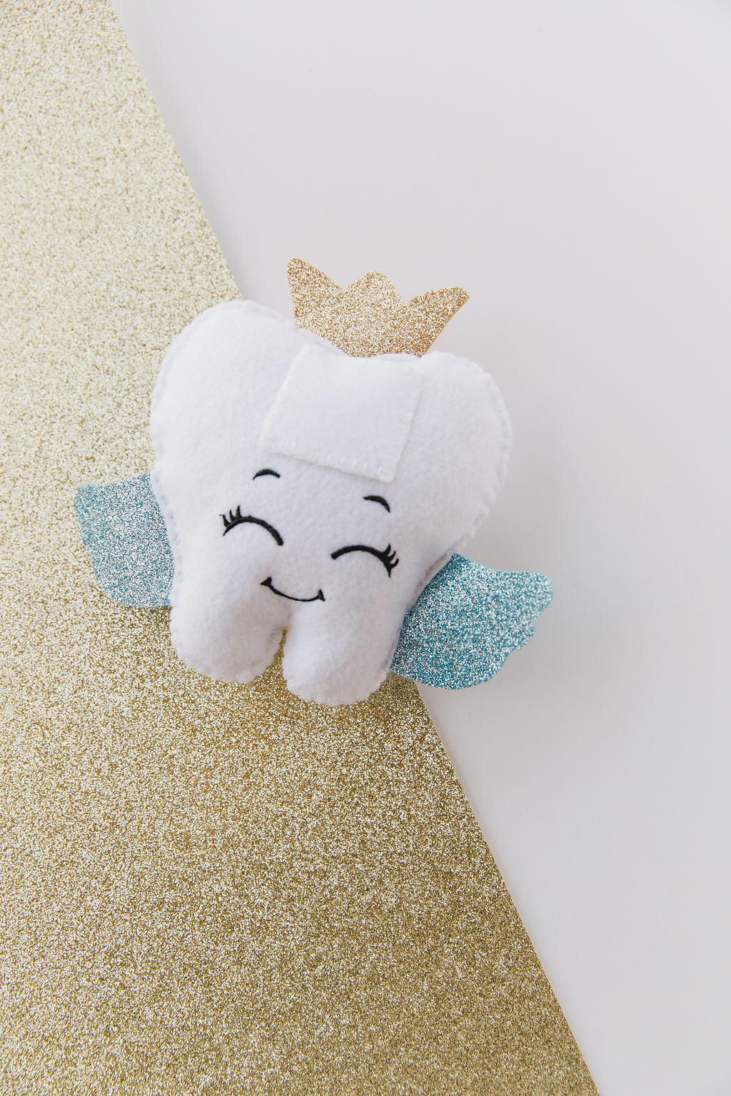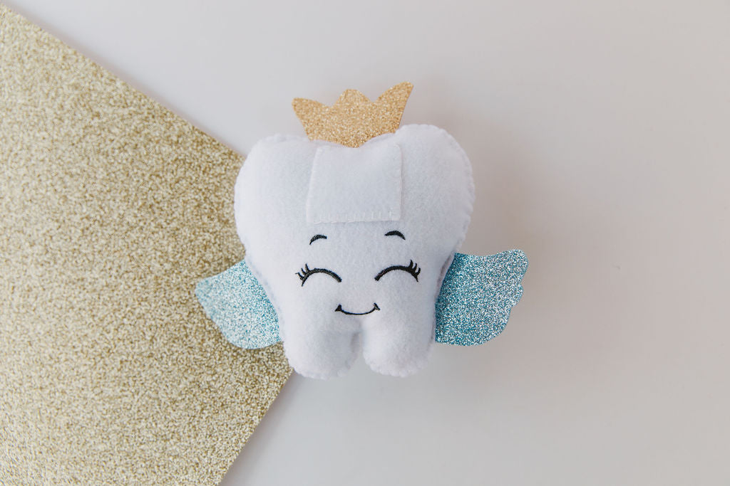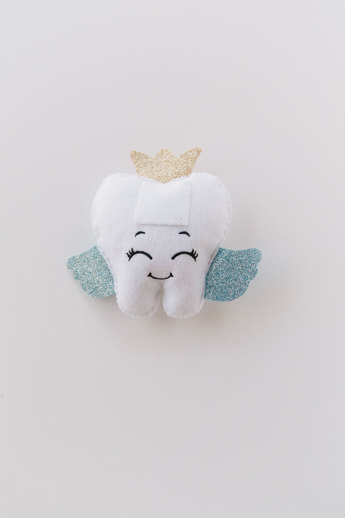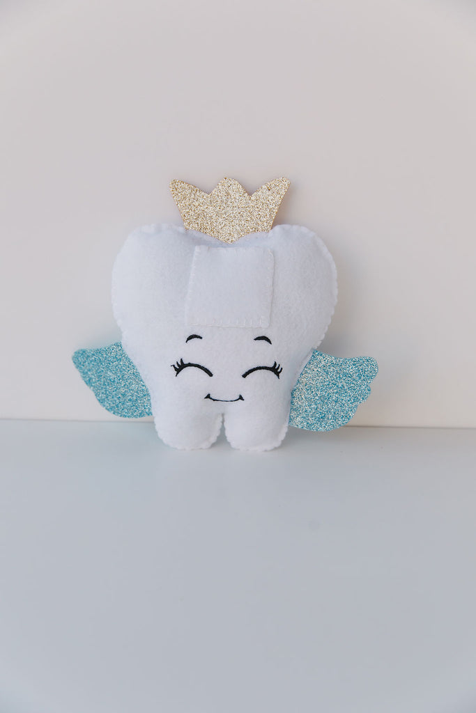 This Felt Tooth Fairy pillow is designed to safely hold your child’s lost tooth and the special tooth fairy money. Adorned with glittery blue wings and a charming gold crown, it features cute embroidered facial details that bring a sweet, magical touch.