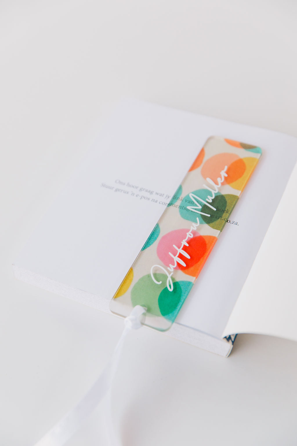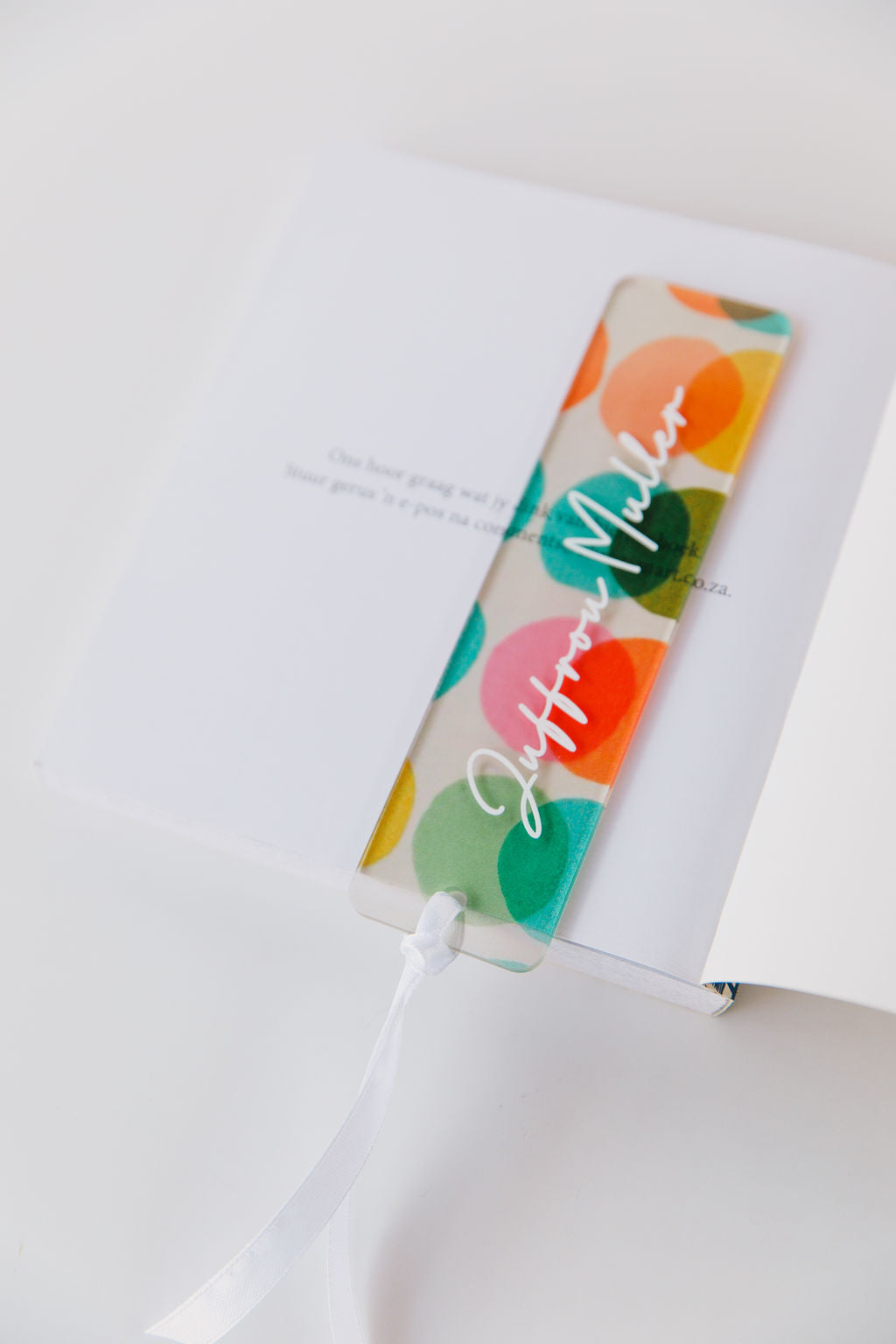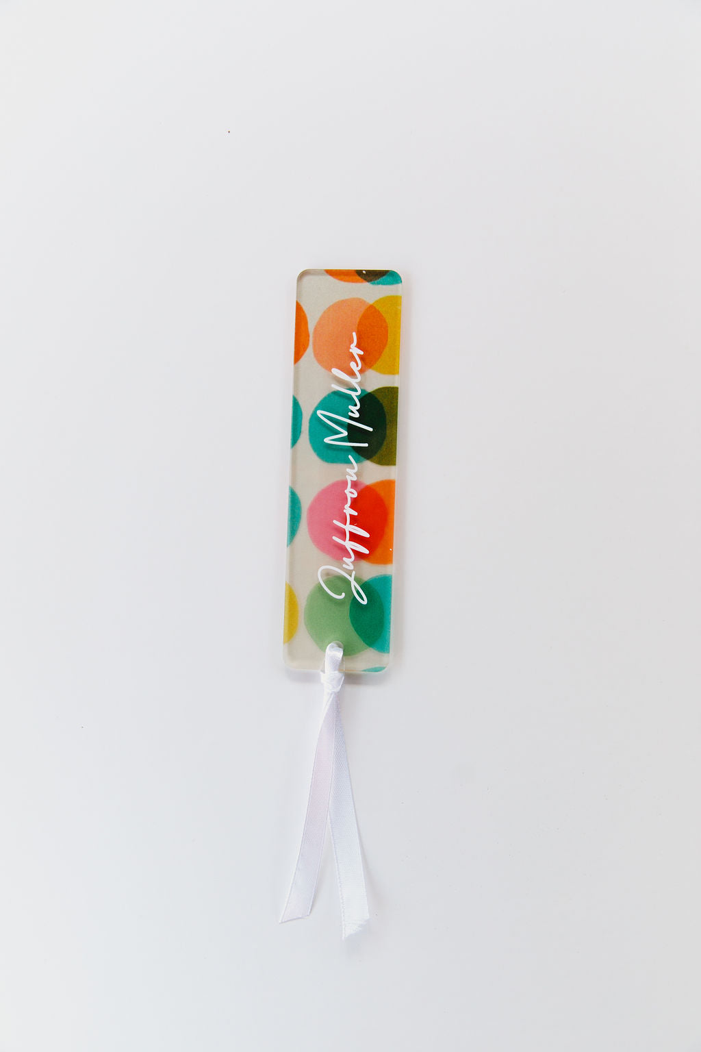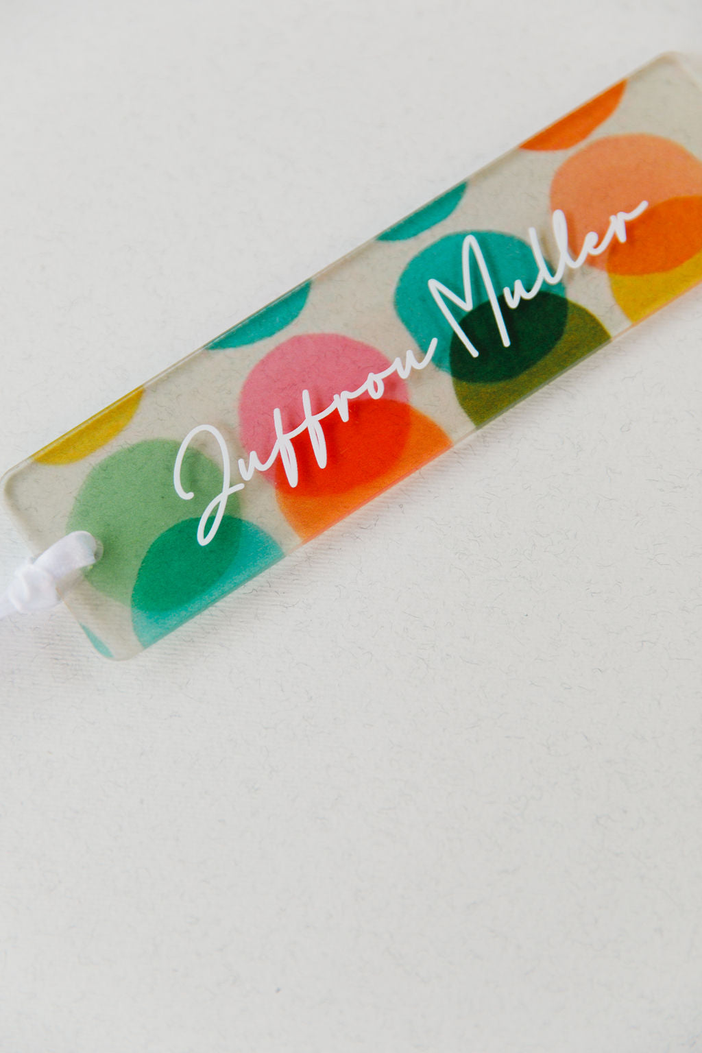 Personalised acrylic book mark with a beautiful uv printed circles, including your selected name. Finished off with a white satin ribbon.