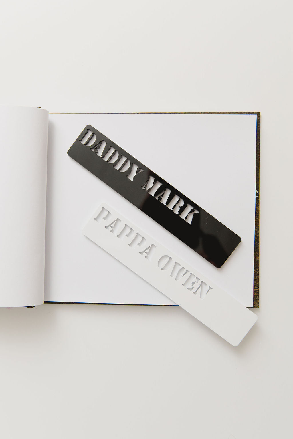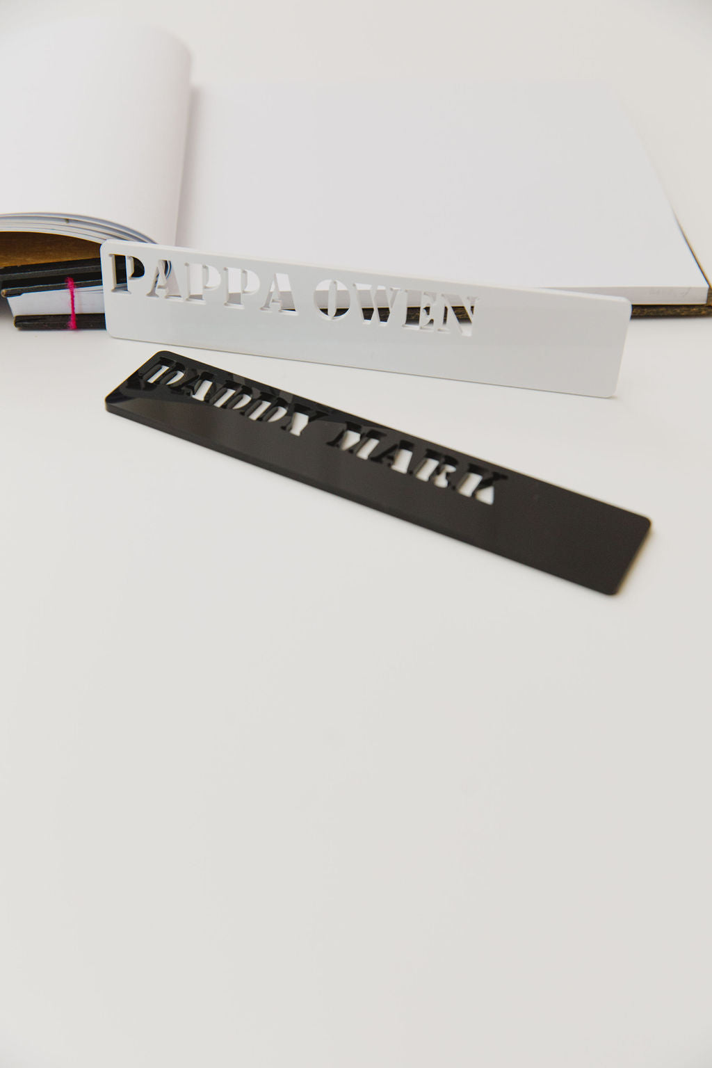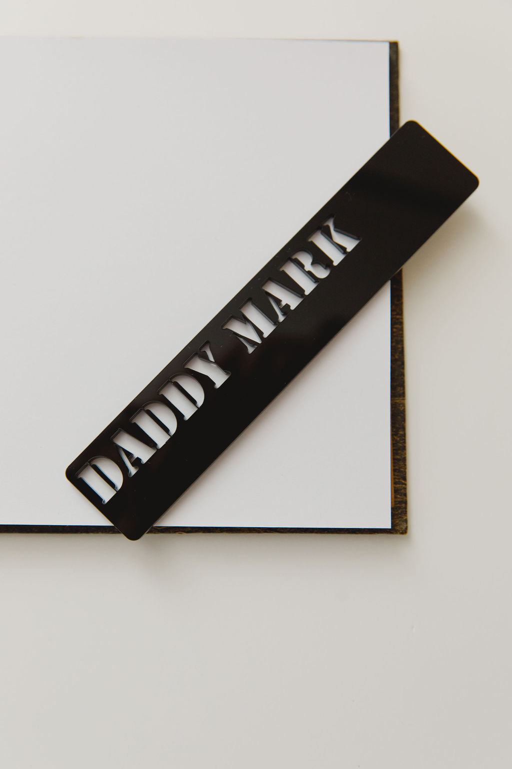 Keep dad's place in style with our Acrylic Book Mark! Featuring a sleek, masculine design and customisable cut-out of "dad" or "pappa" with their name, it's perfect for the avid reader or note-taker.