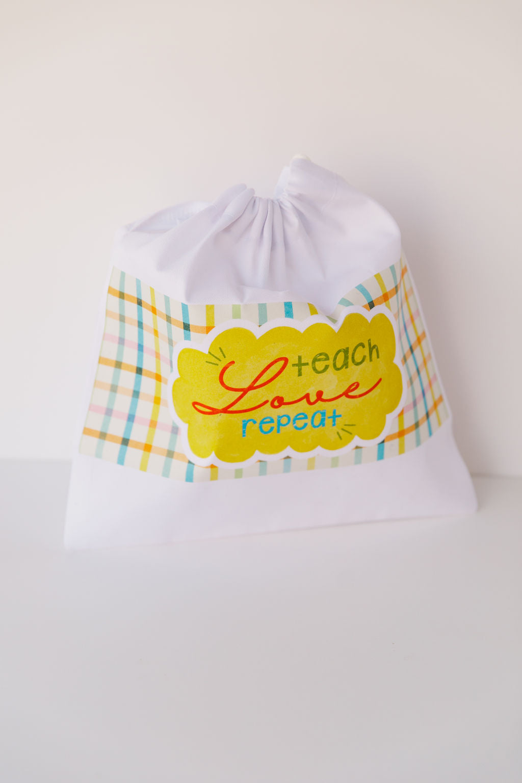 Brighten any teacher’s day with this handmade 100% cotton bag, featuring the inspiring message “Teach, Love, Repeat.” Measuring approximately 30x30cm, this charming bag is finished with a drawstring ribbon for easy closure.
