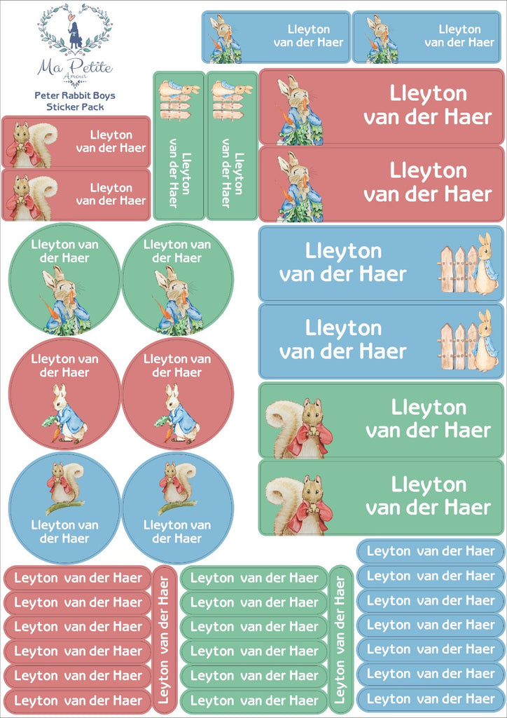 Blue Peter Rabbit themed school labels to help label all your little one's school items. Personalised with their names in an easy to read font.